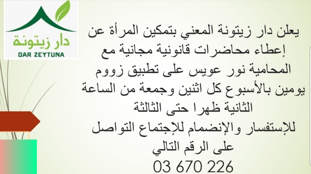 بسب الظروف الراهنة والوضع الوبائي العالمي الحاصل في البلاد وبقاء الناس في بيوتهم بسبب الحجر الصحي، أدى ذلك إلى زيادة نسبة العنف المنزلي بين أفراد الأسرة وظهور العنف والتمييز ضد المرأة بأشكاله وأنواعه. لذلك قرر دار زيتونة في لبنان تقديم محاضرات قانونية مجانية عبر تطبيق زووم للنساء في بيوتهم